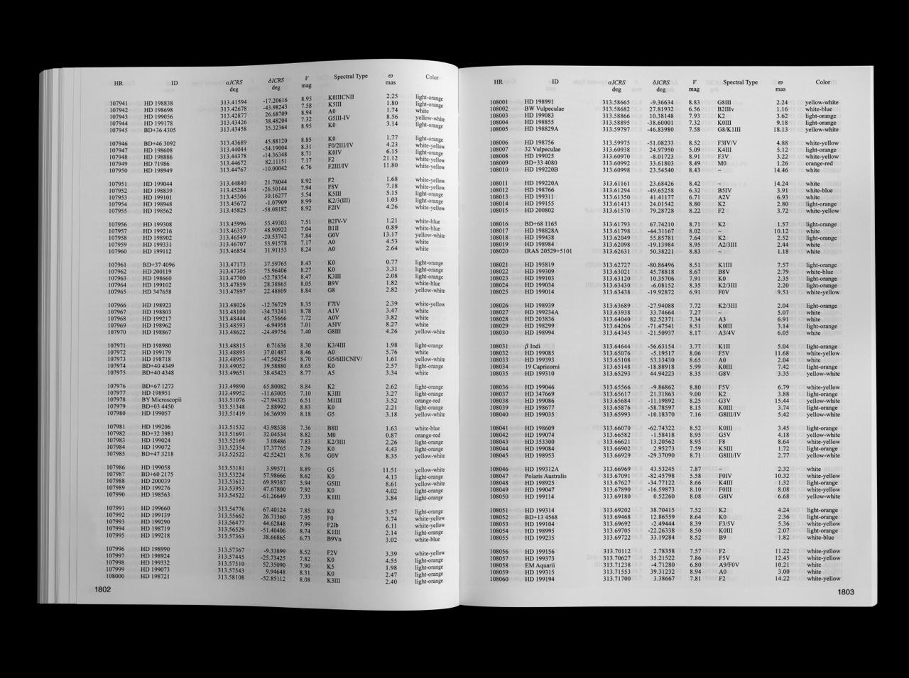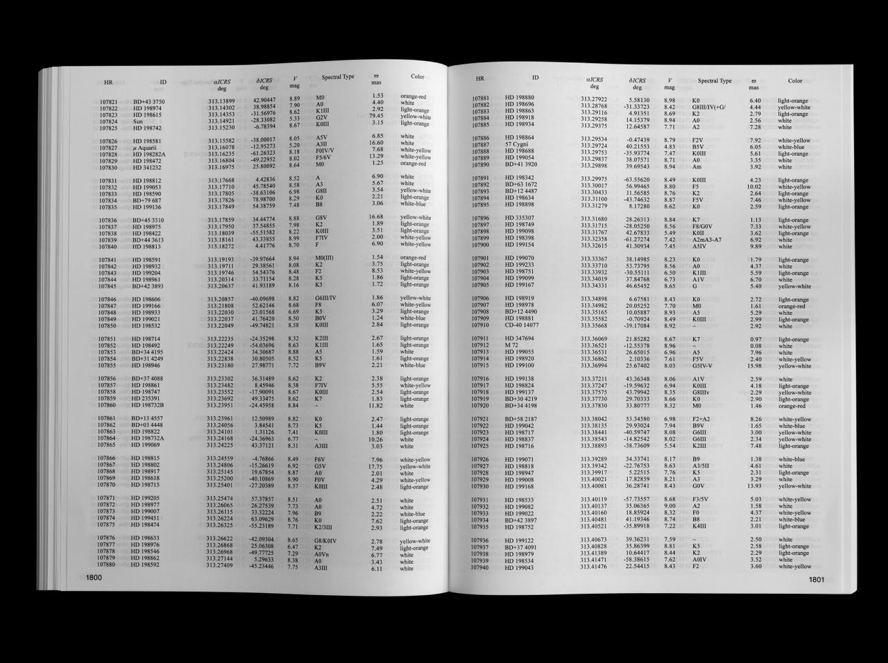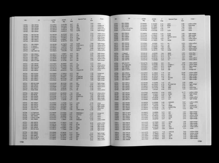 The book — a two-thousand page star catalog, lists the stars in view from 55 Cancri / Copernicus system, along with their coordinates and qualities. The gaze is reversed, and the Sun is dissolved into the visible 123,663 points of light, as seen from Cancri 55e.